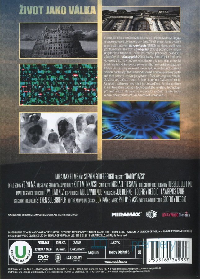 Téměř dvacet let od uvedení první části s názvem Koyaanisqatsi (1983), na kterou o pět roků později navázal snímkem Powaqqatsi (1988), podařilo se tomuto originálnímu filmovému tvůrci po mnoha peripetiích dokončit i závěrečný díl - Naqoyqatsi (2002). Názvy všech tří jeho filmů jsou odvozeny z jazyka ohroženého indiánského kmene Hopi a provází je minimalistické kompozice světoznámého newyorského skladatele Philipa Glasse, který se, kromě jiného, řadu let systematicky zabýval studiem hudby nejrůznějších národů včetně Indiánů. Výraz Naqoyqatsi má hned trojí spolu související význam: 1. Život jako vzájemné zabíjení, 2. Válka jako způsob života, 3. (interpretováno) Civilizované násilí. Ústřední myšlenkou této části je přesvědčení, že vše směřuje k unifikovanému způsobu technologického myšlení. Technologie přestává sloužit, ale stává se rozhodující součástí našeho života a bere všechny možnosti, jak si zachovat individualitu.