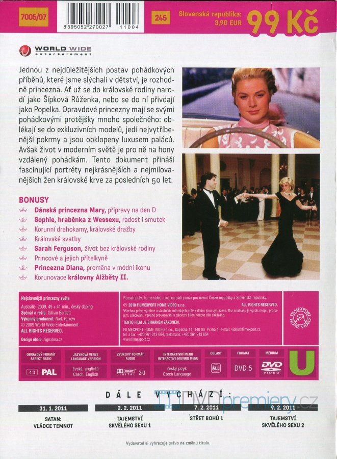 Ať už se do královské rodiny narodí jako Šípková Růženka, nebo se do ní přivdají jako Popelka. Opravdové princezny mají se svými pohádkovými protějšky mnoho společného: oblékají se do exkluzivních modelů, jedí nejvytříbenější pokrmy a jsou obklopeny luxusem paláců. Avšak život v moderním světě je pro ně na hony vzdálený pohádkám. Tento dokument přináší fascinující portréty nejkrásnějších a nejmilovanějších žen královské krve za posledních 50 let. Vydáte se s ním na velkolepý výlet plný romantické lásky, zármutku, tragédie i protikladů, jež urozený život těmto moderním pohádkovým princeznám přináší. Společenské tlaky i velká očekávání královských rodin činí život těchto soudobých princezen daleko odlišnější a náročnější než jakákoli pohádka. Tato mimořádná kolekce přináší portréty princezny Diany, kněžny Grace, vévodkyně Fergie a mnoha dalších urozených dam.