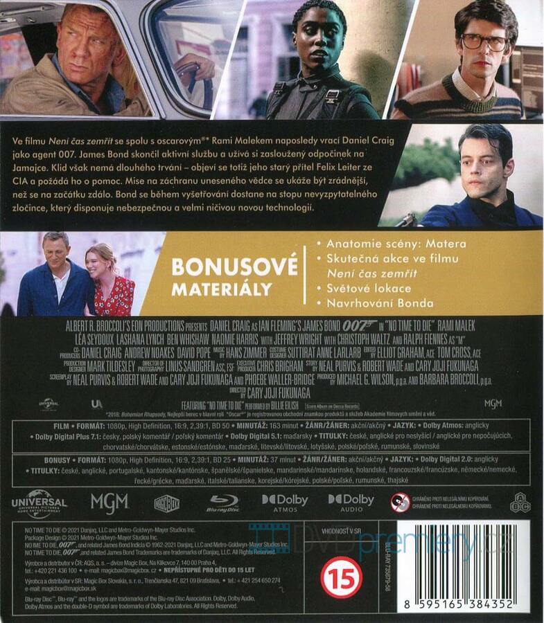 Ve filmu Není čas zemřít se spolu s Oscarovým Rami Malekem naposledy vrací Daniel Craig jako agent 007. James Bond skončil aktivní službu a užívá si zasloužený odpočinek na Jamajce. Klid však nemá dlouhého trvání – objeví se totiž jeho starý přítel Felix Leiter ze CIA a požádá ho o pomoc. Mise na záchranu uneseného vědce se ukáže být zrádnější, než se na začátku zdálo. Bond se během vyšetřování dostane na stopu nevyzpytatelného zločince, který disponuje nebezpečnou a velmi ničivou novou technologií.