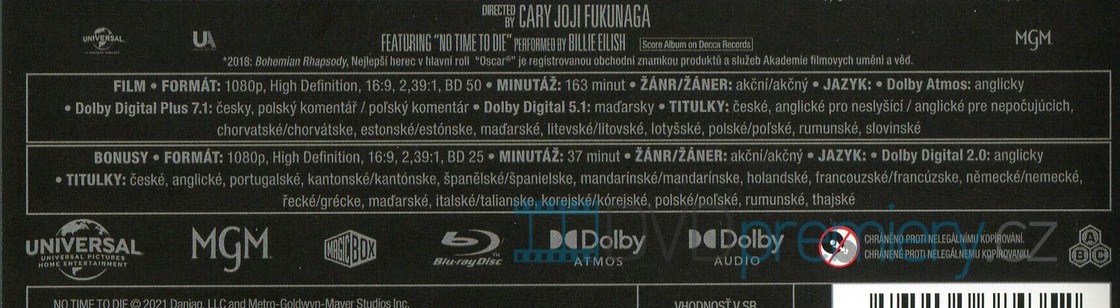 Blu-ray HD film Není čas zemřít [No Time to Die, 2021]. Český dabing. České titulky. Dolby Digital. Dolby Atmos. Hrají: Daniel Craig. Nový James Bond 25. Poslední film s Danielem Craigem v hlavní roli.