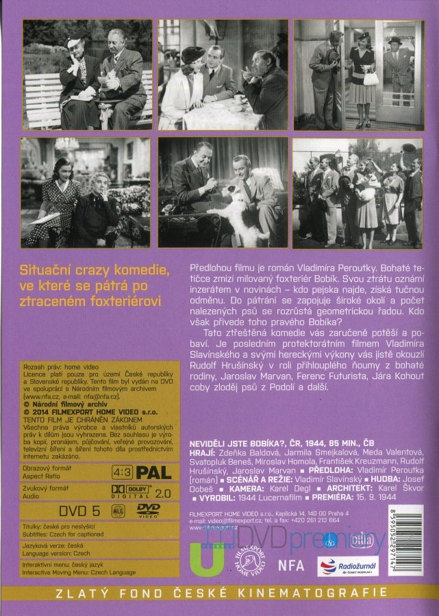 DVD film Neviděli jste Bobíka? [1944]. Československý film pro pamětníky. Dolby Digital. Situační crazy komedie, ve které se pátrá po ztraceném foxteriérovi.