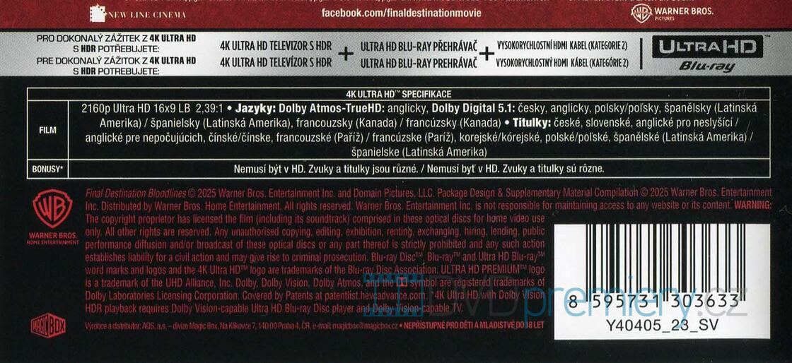 4K Blu-ray film Nezvratný osud 6: Pokrevní linie HD [2025]. Český dabing. České titulky. HDR. Dolby Digital. Dolby Atmos. Steelbook sběratelské balení - motiv Alt Skull. Nejnovější pokračování hororové série.