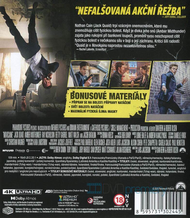 4K Blu-ray film Novokain HD [2025]. České titulky. HDR. Dolby Digital. Dolby Atmos. Říkají mu Novokain, protože díky vzácnému „postižení“ necítí fyzickou bolest. Unesli byste někomu takovému přítelkyni?