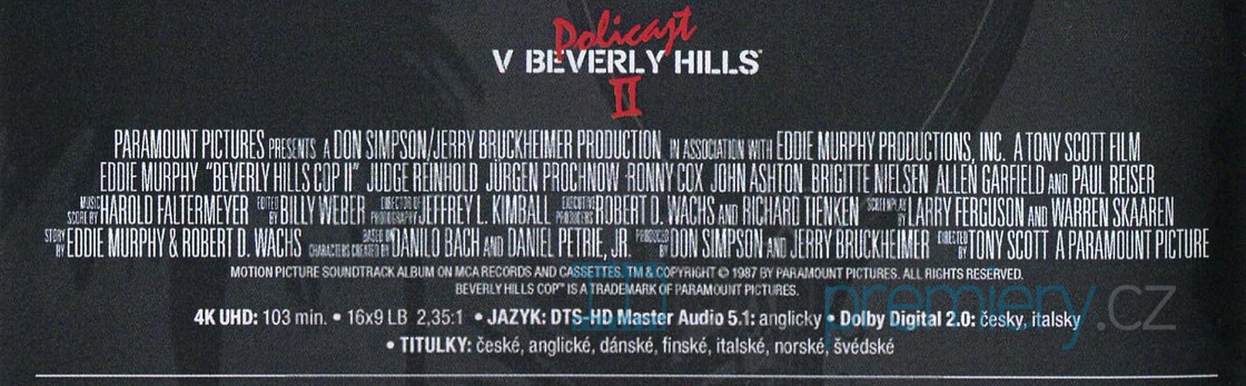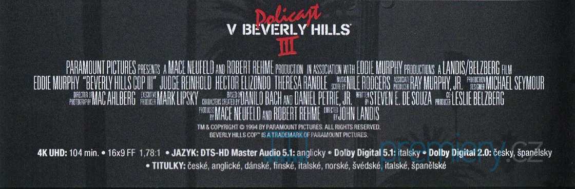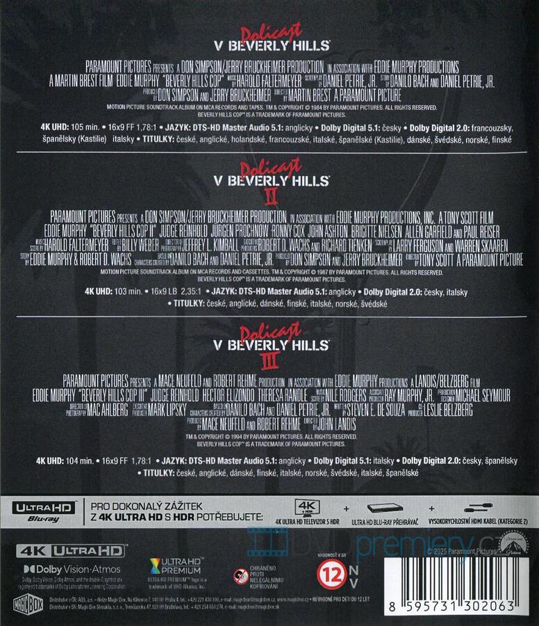 4K Blu-ray kolekce obsahuje filmy: Policajt v Beverly Hills 1-3 HD. 3 disky. Český dabing. České titulky. HDR. Dolby Digital.