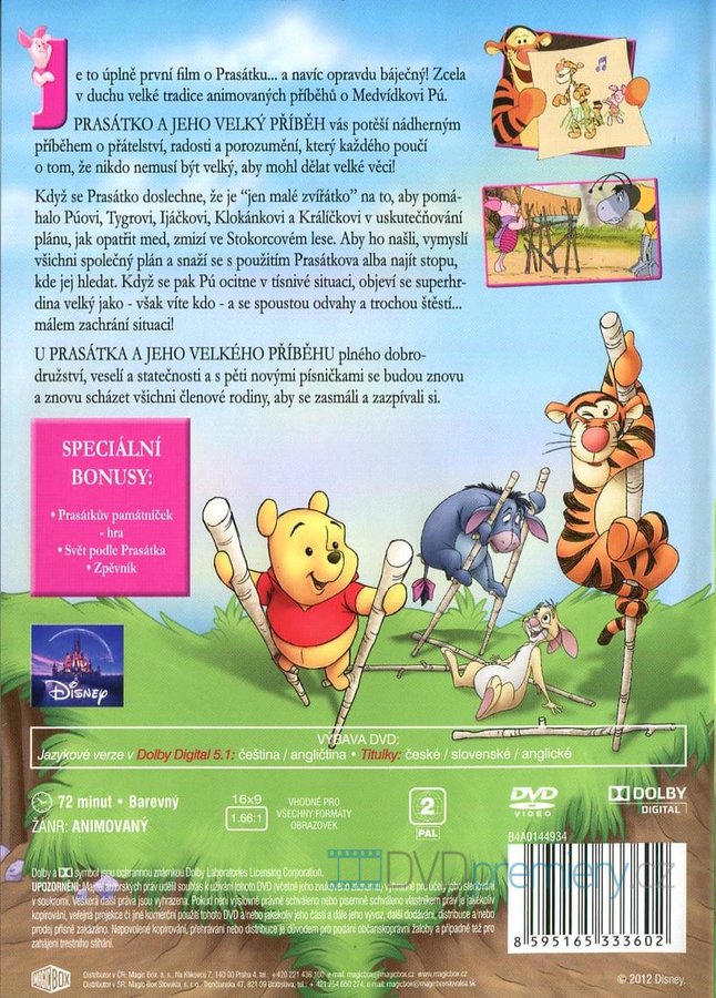 PRASÁTKO A JEHO VELKÝ PŘÍBĚH vás potěší nádherným příběhem o přátelství, radosti a porozumění, který každého poučí o tom, že nikdo nemusí být velký, aby mohl dělat velké věci! Když se Prasátko doslechne, že je “jen malé zvířátko” na to, aby pomáhalo Púovi, Tygrovi, Ijáčkovi, Klokánkovi a Králíčkovi v uskutečňování plánu, jak opatřit med, zmizí ve Stokorcovém lese. Aby ho našli, vymyslí všichni společný plán a snaží se s použitím Prasátkova alba najít stopu, kde jej hledat. Když se pak Pú ocitne v tísnivé situaci, objeví se superhrdina velký jako - však víte kdo - a se spoustou odvahy a trochou štěstí... málem zachrání situaci! U PRASÁTKA A JEHO VELKÉHO PŘÍBĚHU plného dobrodružství, veselí a statečnosti a s pěti novými písničkami se budou znovu a znovu scházet všichni členové rodiny, aby se zasmáli a zazpívali si.