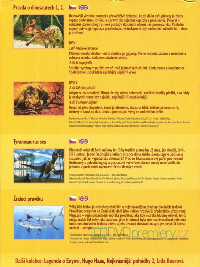 Kolekce obsahuje dokumentární filmy: Pravda o dinosaurech, Tyranosaurus sex, Žraloci pravěku.