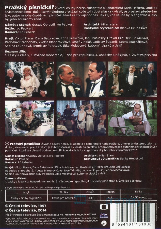DVD film Pražský písničkář [1997]. Český dabing. České titulky. Dolby Digital. Nesmělý herec Hašler sní o české písničce. První láska, první kroky na jevišti. Začátek legendy.