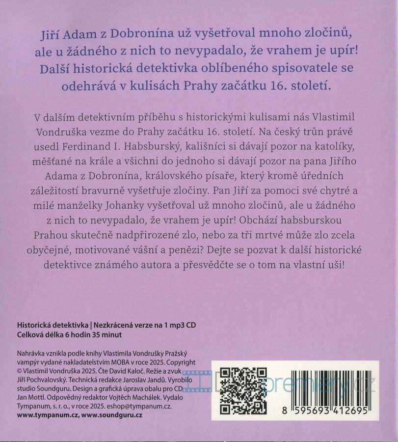 Audiokniha od autora: Vlastimil Vondruška, čte: David Kaloč. Délka nahrávky: 6 hodin, 35 minut. Upíří vraždy v Praze 16. století! Jiří Adam z Dobronína čelí nejpodivnějšímu případu své kariéry.