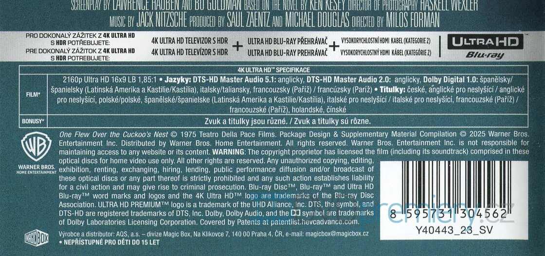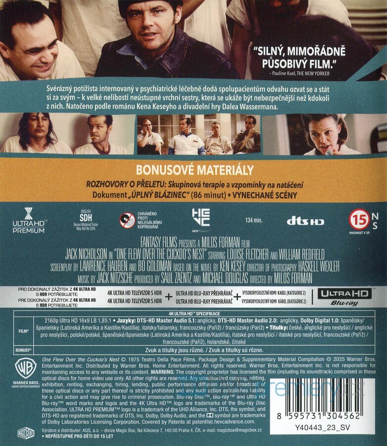4K Blu-ray film Přelet nad kukaččím hnízdem HD [1975]. České titulky. Dolby Digital. Hrají: Jack Nicholson. Režie: Miloš Forman. Držitel 5 Oscarů (1975) včetně nejlepšího filmu.