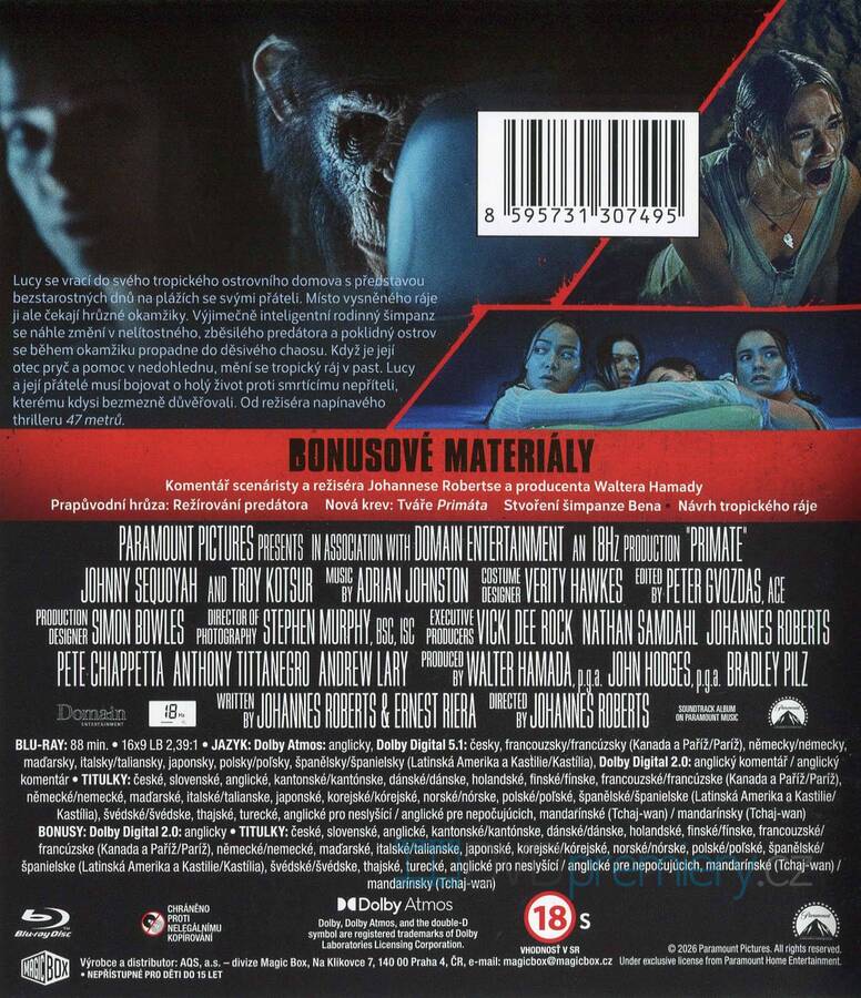 Blu-ray film Primát HD [2025]. Český dabing. České titulky. Dolby Digital. Dolby Atmos. Šimpanzi nikdy nebyli tak děsiví. Primát vám z nich udělá noční můru - stejně jako Čelisti ze žraloků.