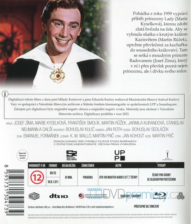 Blu-ray film Princezna se zlatou hvězdou HD [1959]. Český film. Dolby Digital. Digitálně restaurovaný film. Pohádka o princezně Ladě, která utíká před nechtěným sňatkem a jako kuchtička najde pravou lásku u prince Radovana.