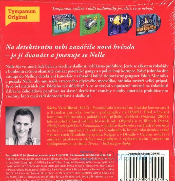 Nelle žije ve městě, kde byla na všechny sladkosti vyhlášena prohibice. Jenže se zákazem čokolády a bonbonů začnou okamžitě vznikat pašerácké gangy a v policii bují korupce. Když jednoho dne vstoupí do Nelliny detektivní kanceláře v zahradní kůlně zlopověstný gangster Eddie Mentolka a požádá Nelle, aby mu našla ztraceného plyšového medvídka, hrdinka zavětří velký případ. Ale než se jí podaří méďu vypátrat, zmizí i Eddie. Proč byl medvídek pro Eddieho tak důležitý? A co se skrývá v opuštěné továrně na čokoládu? Zábavná "báječně čokoládová" parafráze na slavné detektivní romány z doby americké prohibice okouzlí nejen děti, ale i hravé dospělé.