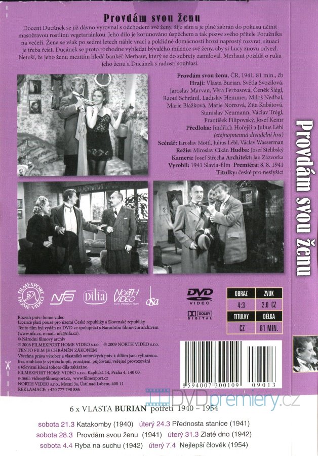 DVD film Provdám svou ženu [1941]. Československý film pro pamětníky. Dolby Digital. Papírový obal. Filmové zpracování úspěšné inscenace Burianova divadla.
