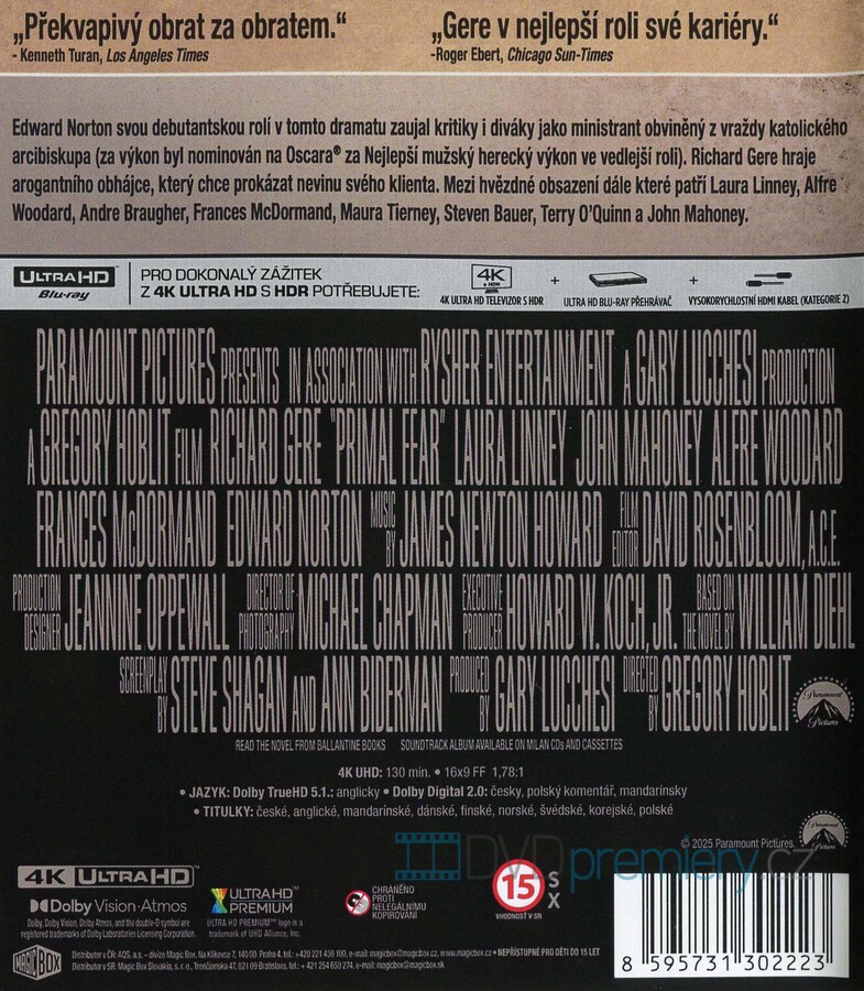 4K Blu-ray film Prvotní strach HD [1996]. Český dabing. České titulky. HDR. Dolby Digital. Ambiciózní právník Martin Vail obhajuje ministranta obviněného z vraždy arcibiskupa, přičemž odhaluje korupci a čelí osobním i profesním výzvám.