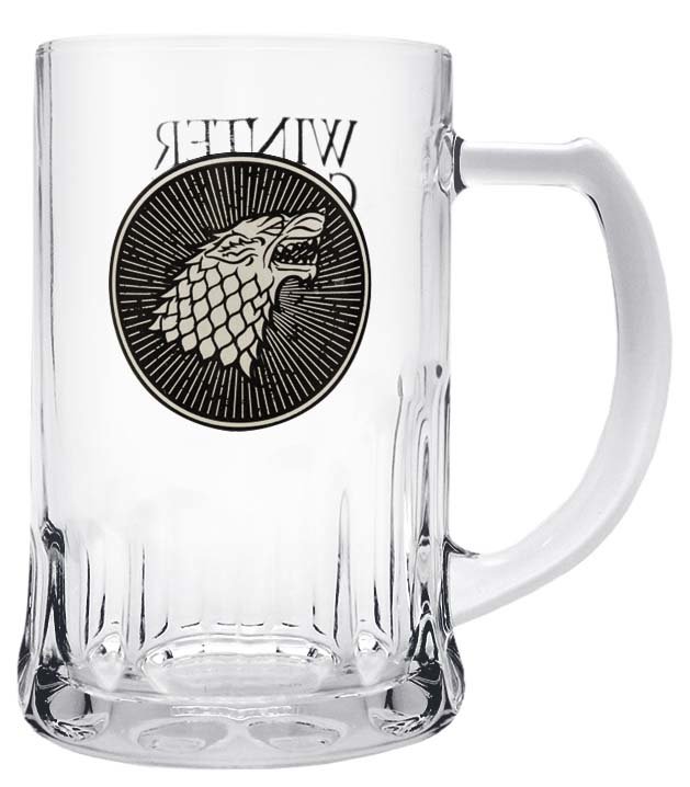 Skleněný půllitr s rodovým znakem Starků na motivy seriálu Game of Thrones.