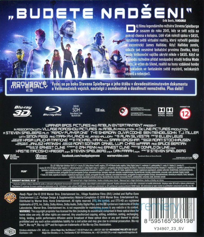 Vychutnejte si jedinečný zážitek ve 3D v pohodlí domova s filmem Ready Player One: Hra začíná. Zdarma je také přiložen BLU-RAY s 2D verzí filmu.
