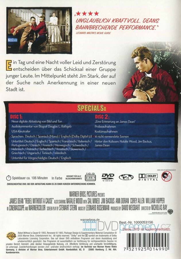 DVD film Rebel bez příčiny [1955]. České titulky. Dolby Digital. Dovoz. I po více než půlstoletí od premiéry zůstává REBEL BEZ PŘÍČINY jedním z nejlepších filmů všech dob.
