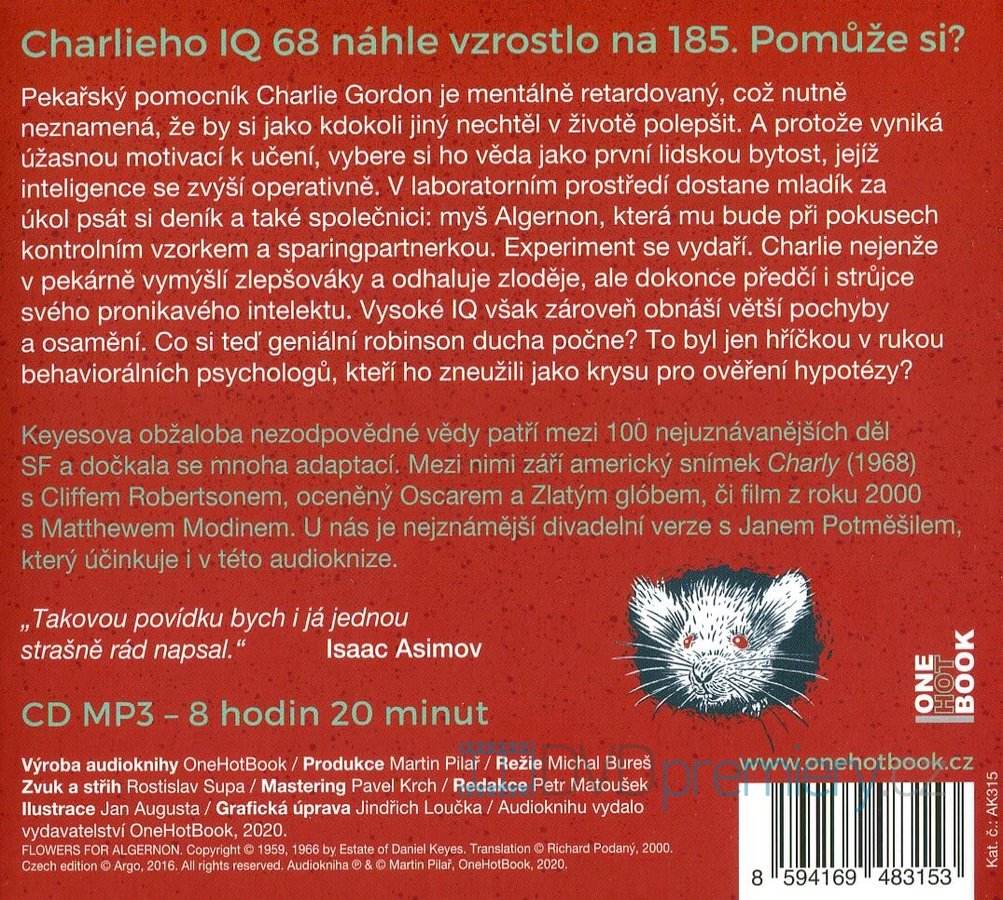 Audioknihu Růže pro Algernon napsal autor: Daniel Keyes, čte: Jan Potměšil. Charlieho IQ 68 náhle vzrostlo na 185. Pomůže si?
