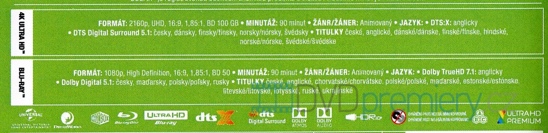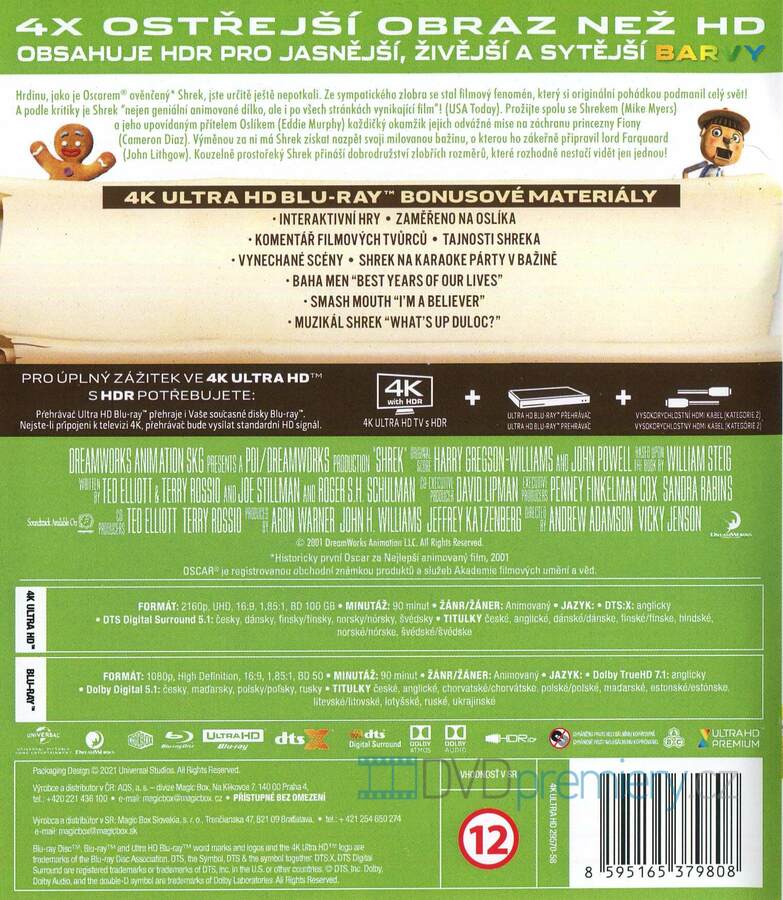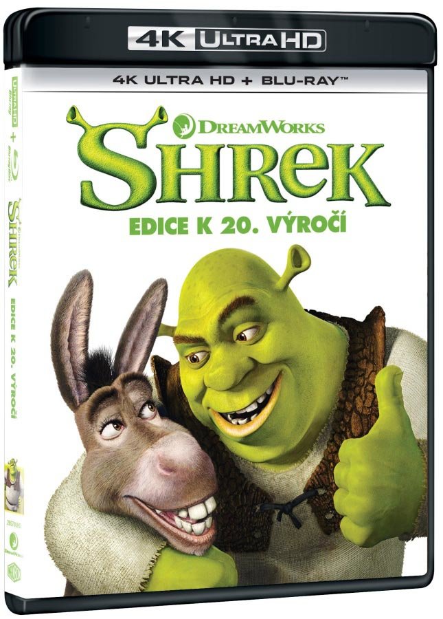 4K UHD BLU-RAY s filmem Shrek (2001) nyní 4x ostřejší než v rozlišení HD. Zdarma je také přiložen FULL HD BLU-RAY disk s filmem. Obsahuje HDR pro jasnější, hlubší a živější barvy.