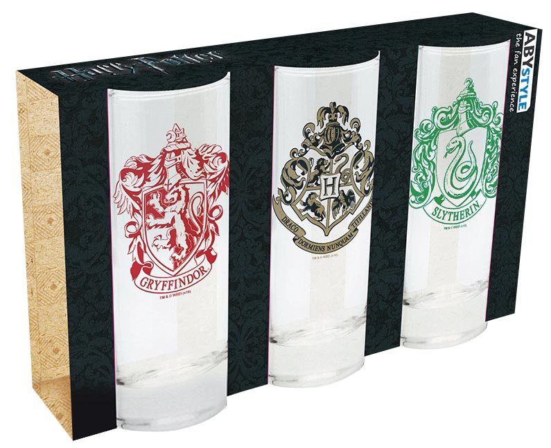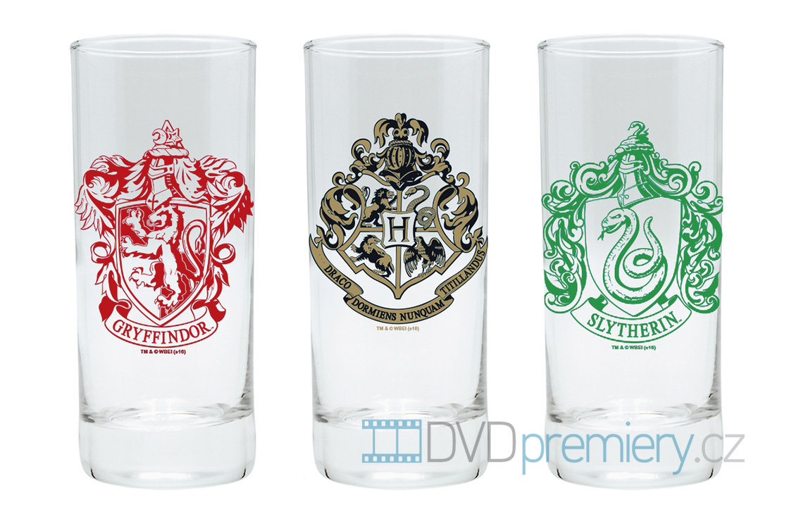 Sada obsahuje 3 sklenice na motivy příběhů Harry Pottera se znaky nejslavnější školy čar a kouzel v Bradavicích, a dvou místních kolejí Nebelvíru a Zmijozelu.
