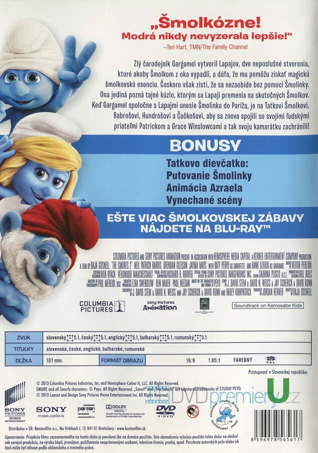 DVD film Šmoulové 2 [2013]. Český dabing. České titulky. Dolby Digital. Dovoz SK. Gargamel unáší Šmoulinku do Paříže! Zachrání ji Šmoulové s lidskými přáteli? Napínavé dobrodružství plné kouzel!