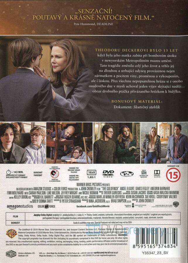 DVD film Stehlík [2019]. České titulky. Dolby Digital. Tragédie v muzeu změní Thea navždy. Zůstane mu jen obraz Stehlíka – symbol naděje uprostřed chaosu. Podle románu oceněného Pulitzerovou cenou.