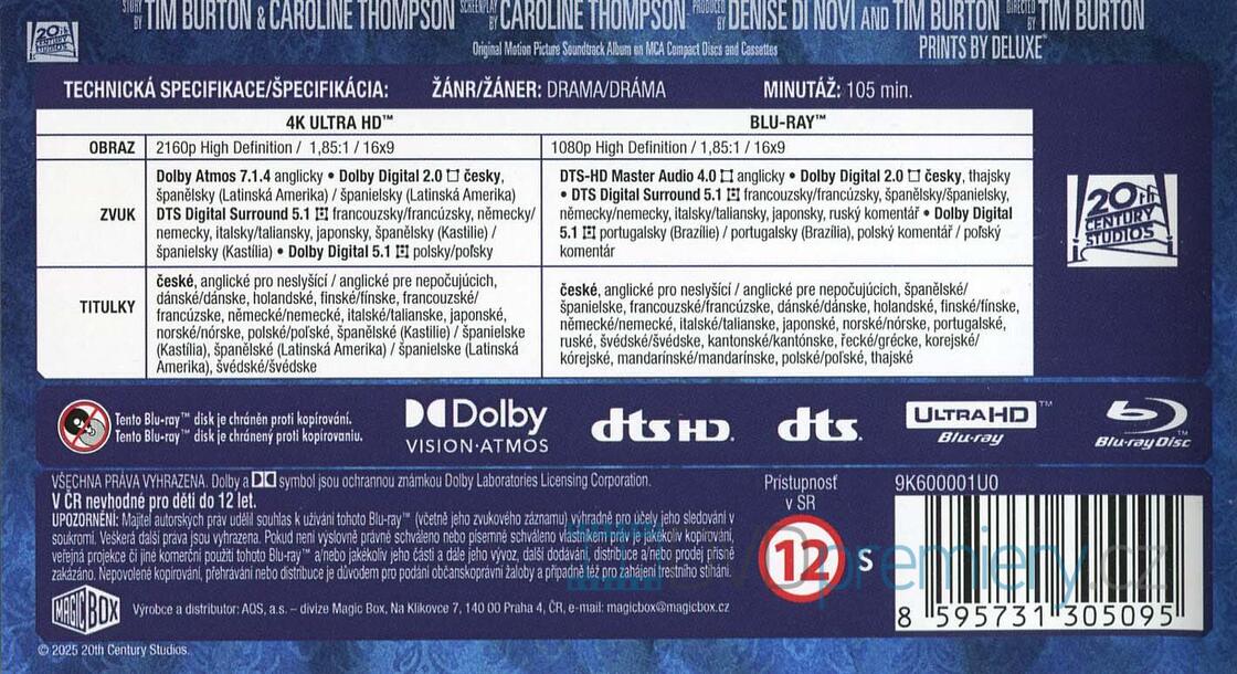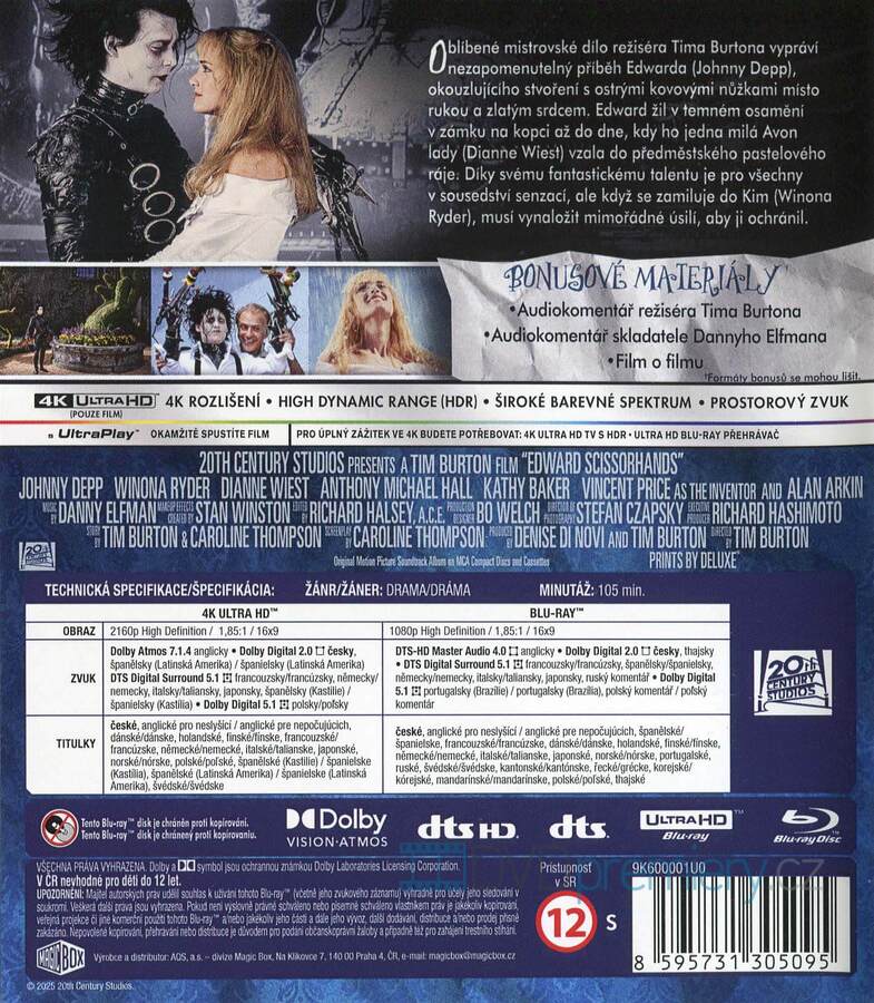 4K Blu-ray film Střihoruký Edward HD [1990]. Český dabing. České titulky. HDR. Dolby Digital. Dolby Atmos. Pohádka o Edwardovi s nůžkami místo rukou. Burtonova fantazie s Deppem a Ryderovou v hlavních rolích.