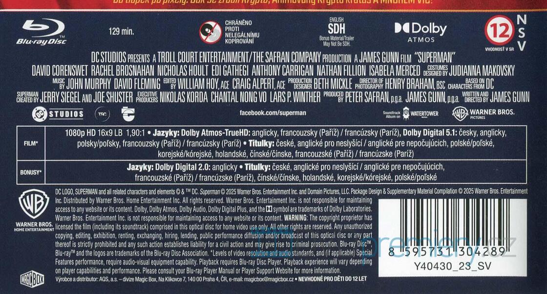 Blu-ray film Superman HD [2025]. Český dabing. České titulky. Dolby Digital. Dolby Atmos. James Gunn přináší nového Supermana plného soucitu v epické směsici akce, humoru a emocí. DC universum!