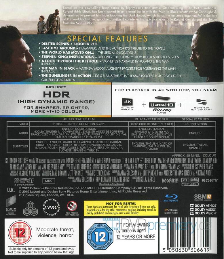 4K Blu-ray film Temná věž HD [2017]. Český dabing. České titulky. HDR. Dolby Digital. Dolby Atmos. Dovoz. Dobro proti zlu. Jeden rytíř. Jeden osud. Temná věž musí být zachráněna za každou cenu.