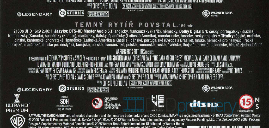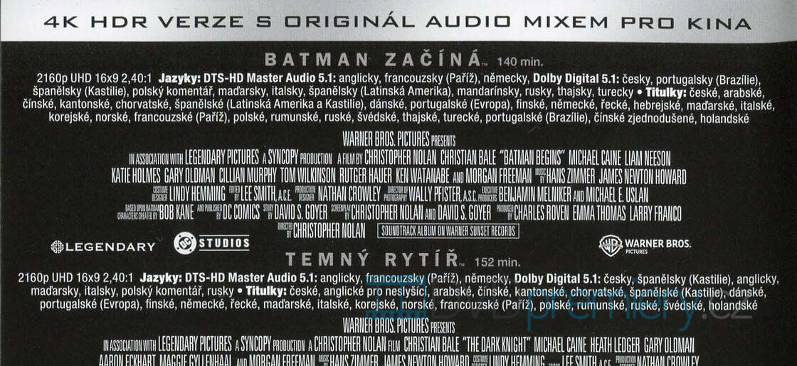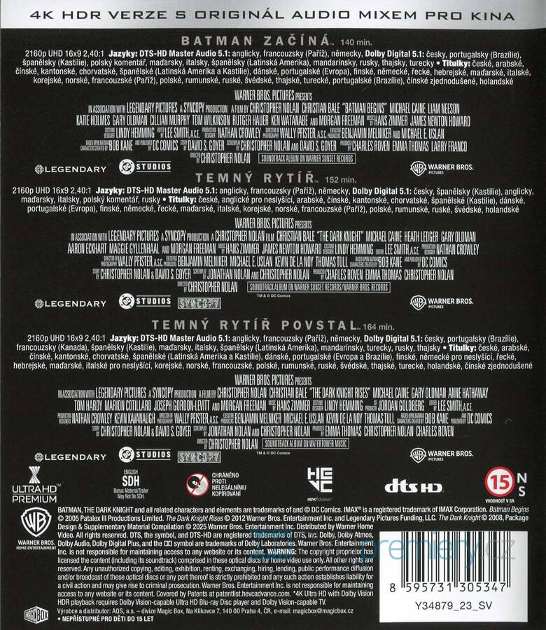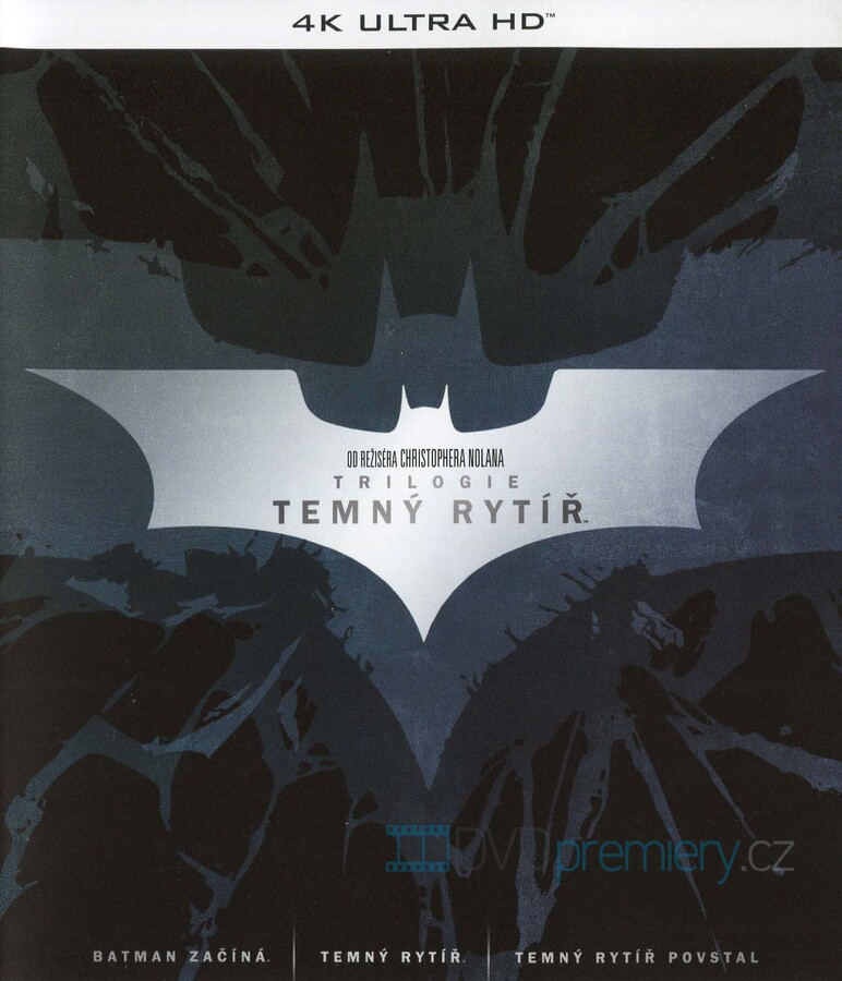 4K Blu-ray kolekce Temný rytíř obsahuje: Batman začíná (4K Blu-ray), Temný Rytíř (4K Blu-ray) a Temný rytíř povstal (4K Blu-ray). CZ dabing.