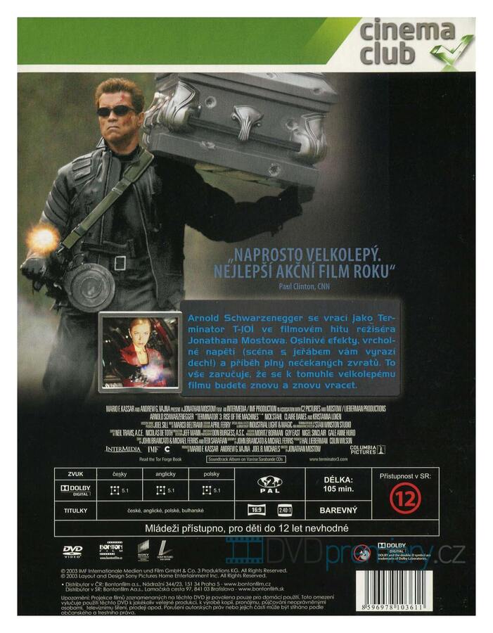 DVD film Terminator 3: Vzpoura strojů [2003]. Český dabing. České titulky. Dolby Digital. Arnold Schwarzenegger je tu opět jako Terminator T-101, který cestuje v čase v explozivním hitu režiséra Jonathana Mostowa.