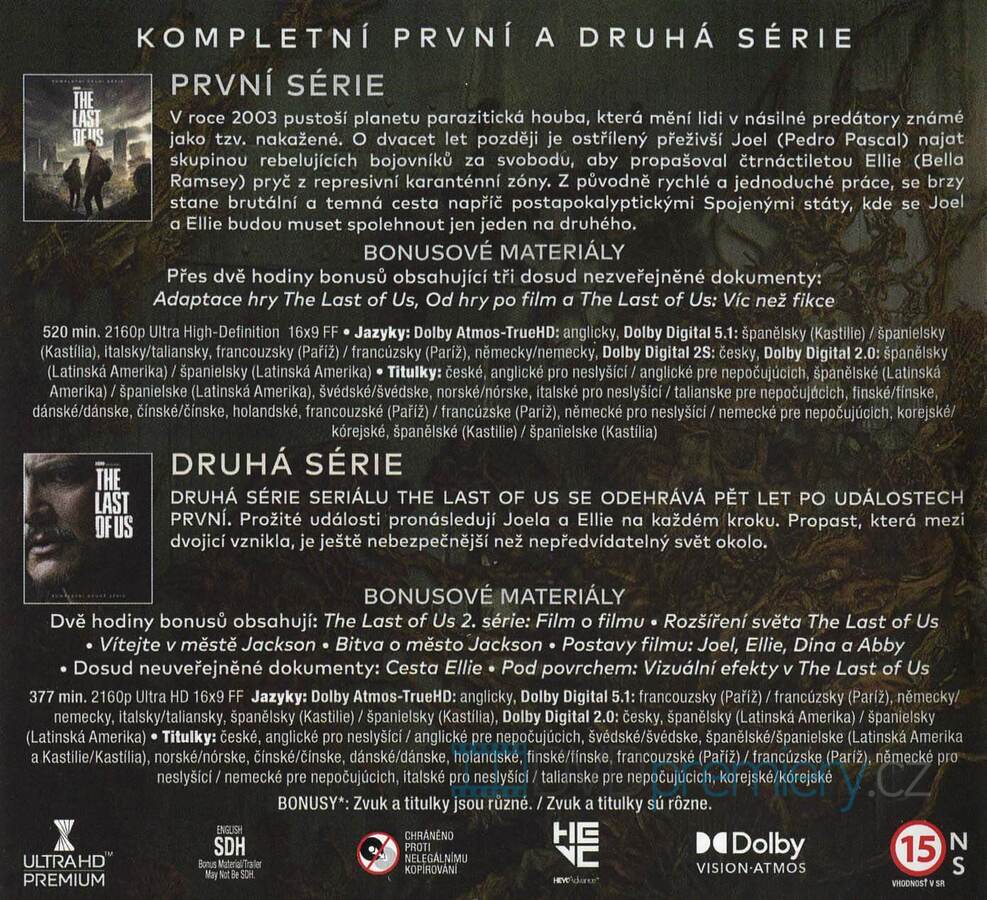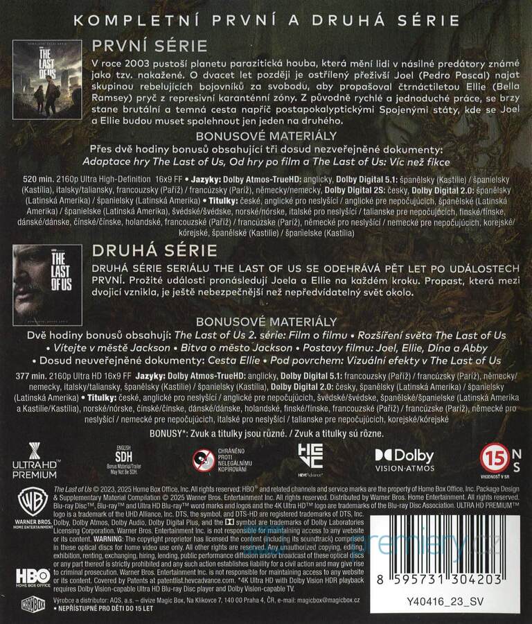 4K Blu-ray kompletní 1.-2. série seriálu The Last of Us. Český dabing. Joel a Ellie bojují o přežití v postapokalyptické Americe. Napětí, důvěra a nebezpečí na každém kroku.