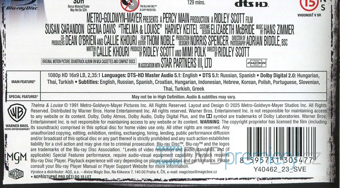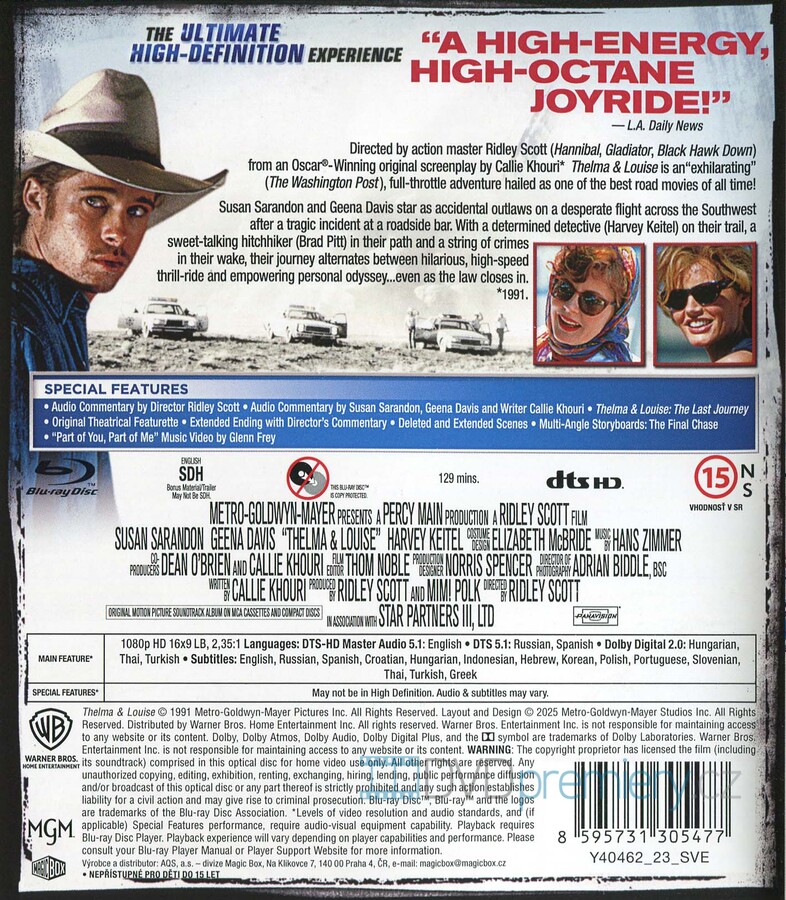 Blu-ray film Thelma a Louise HD [1991]. Bez CZ podpory. Dolby Digital. Kultovní road movie o dvou ženách na útěku. Víkendový výlet se změní v dramatický boj o svobodu a přežití.