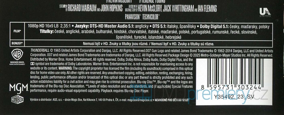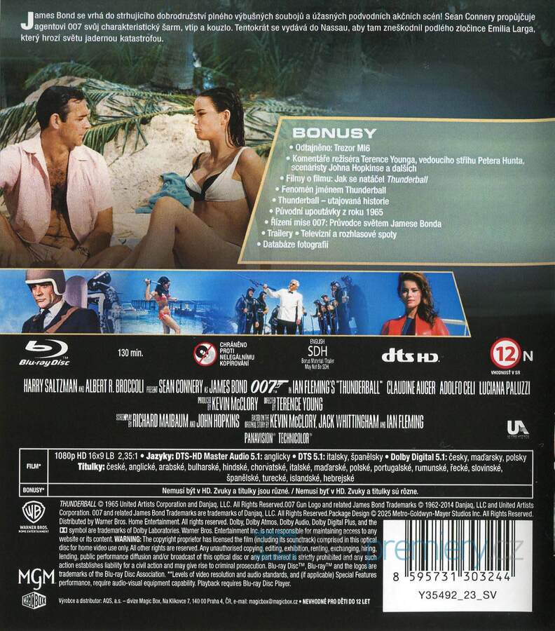 Blu-ray film James Bond - Thunderball HD [1962]. Český dabing. České titulky. Dolby Digital. Sean Connery jako James Bond. Podmořské dobrodružství s atomovými bombami a časem proti zločinci.