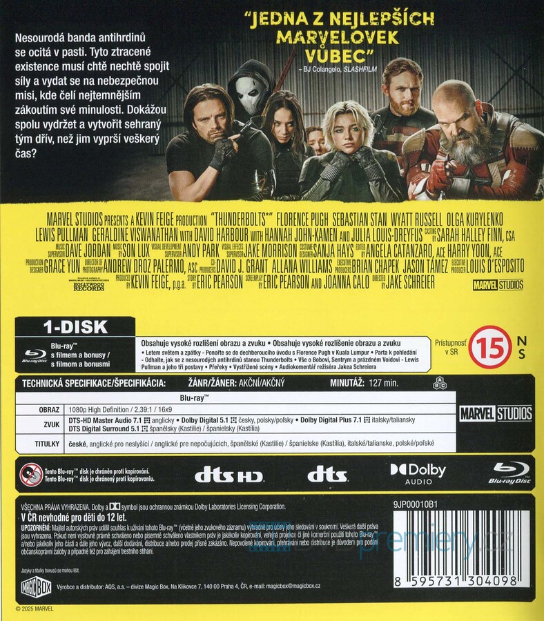 Blu-ray film Thunderbolts* - Noví Avengers HD [2025]. Český dabing. České titulky. Dolby Digital. Thunderbolts*: Neuctivá parta antihrdinů v čele s Yelenou Belovou. Návrat oblíbených postav MCU v akčním týmovém filmu!