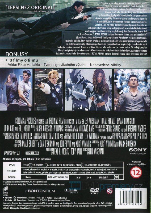 Připravte se na nikdy nekončící zábavu a strhující napětí v “chytrém, sexy a akcí nabitém” (Scott Mantz, Access Hollywood) thrilleru s Colinem Farrellem v roli Douglase Quaida, továrního dělníka, který navštíví revoluční společnost Rekall, aby jeho superšpionské sny proměnila ve skutečné vzpomínky. Plánovaný postup se ale vymyká kontrole a způsobuje, že se hranice mezi fantazií a realitou smazává. Quaid se ocitá na útěku a jeho budoucnost je značně nejistá. Ve vedlejších rolích filmu, který překypuje dech beroucími akčními scénami a velkolepými vizuálními efekty, se představují Kate Beckinsale, Jessica Biel a Bryan Cranston. S Total Recall zažijete dokonalou jízdu plnou vzrušení a energie!