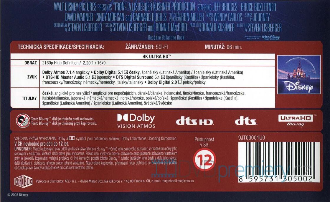4K Blu-ray film Tron HD [1982]. Český dabing. České titulky. Dolby Digital. Dolby Atmos. HDR. Počítačový expert Flynn se ocitá uvězněn v digitálním světě, kde musí porazit nebezpečný program s pomocí Trona.