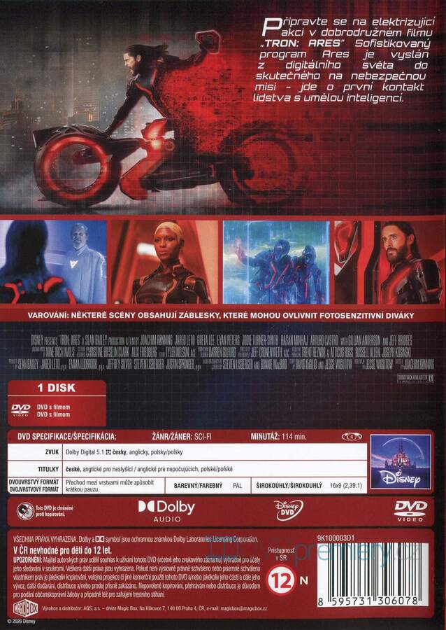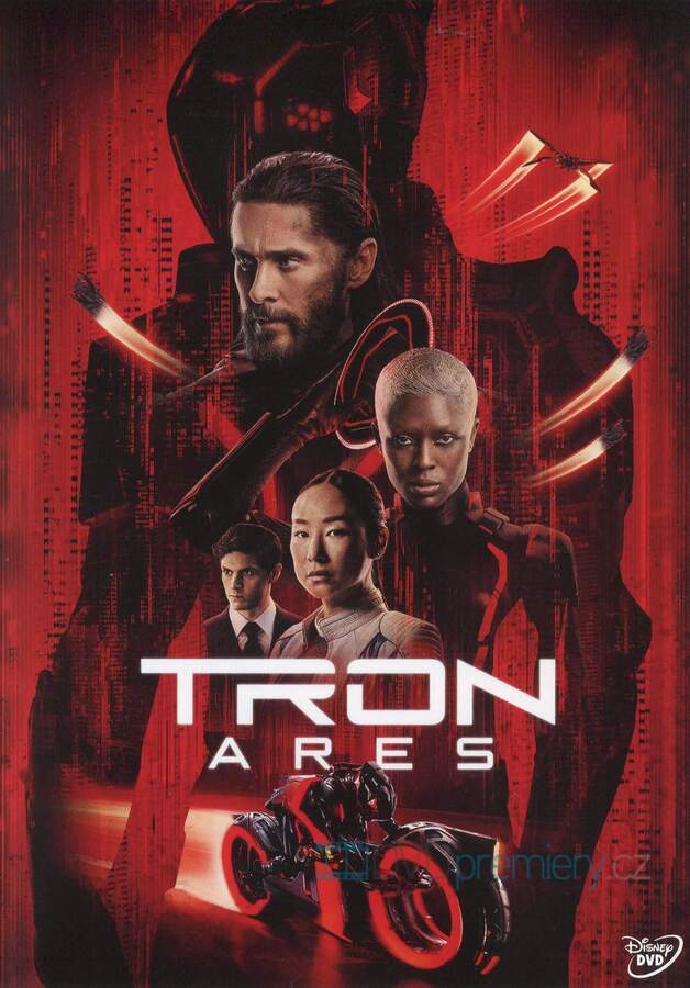 DVD film Tron: Ares [2025]. Český dabing. České titulky. Dolby Digital. Program Ares vstupuje do reality. První kontakt s AI. Drsná sci-fi od režiséra Ronning s Letem a Bridgesem. Hudba Nine Inch Nails.