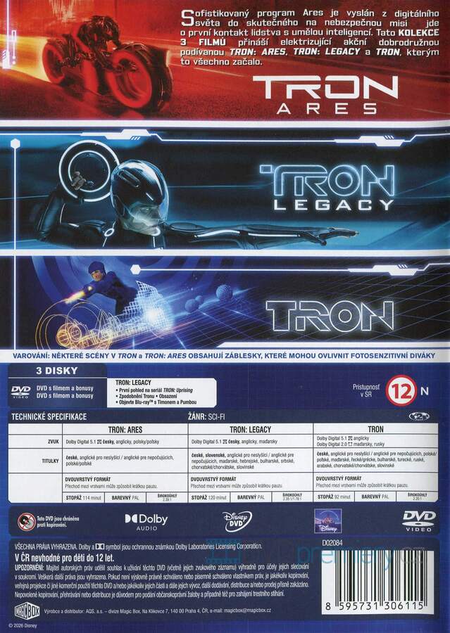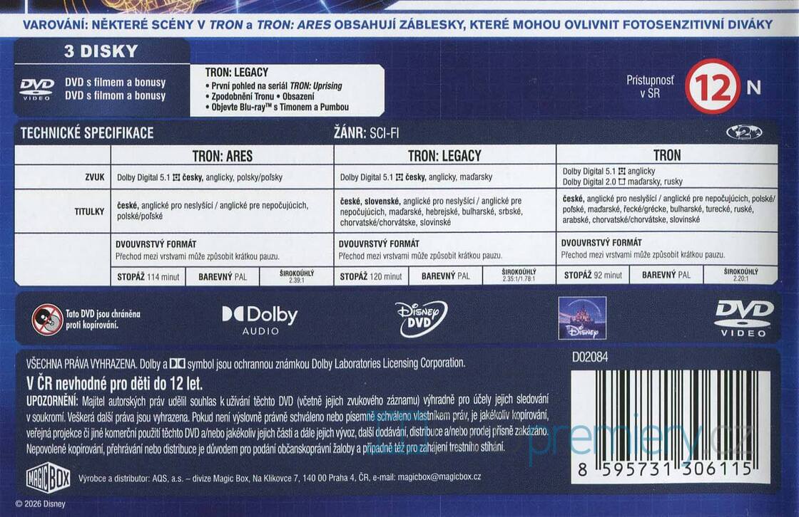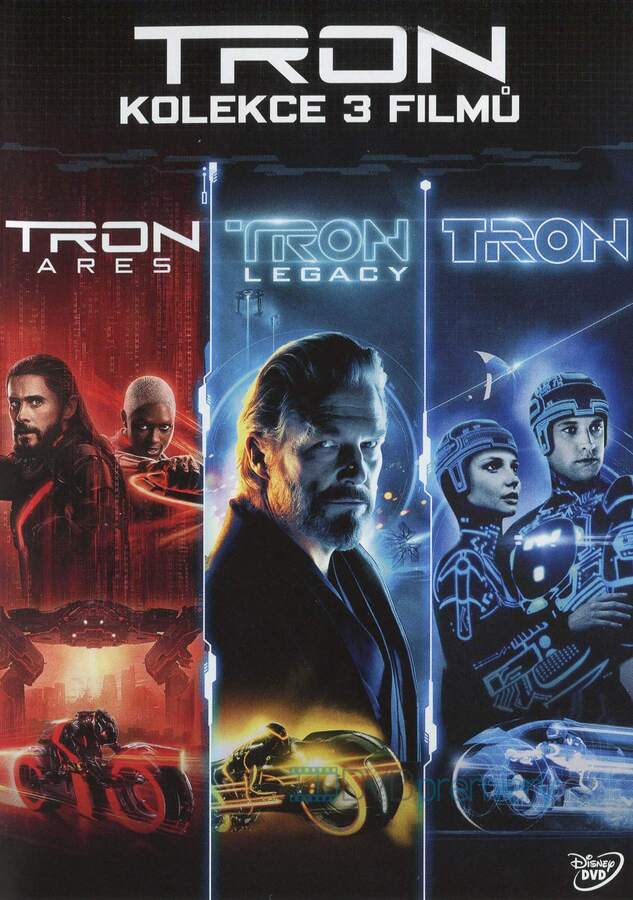 DVD kolekce obsahuje filmy: Tron (CZ titulky), Tron: Legacy (CZ dabing, CZ titulky), Tron: Ares (CZ dabing, CZ titulky).