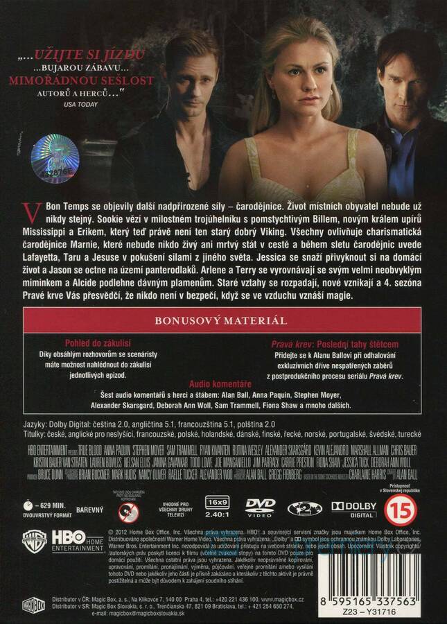 DVD film True Blood - Pravá krev 4. série [2011]. Český dabing. České titulky. HBO seriál. Dolby Digital. Čarodějnice přicházejí do Bon Temps! Sookie v milostném trojúhelníku, Erik proměněn, Marnie seje chaos. Nikdo není v bezpečí.