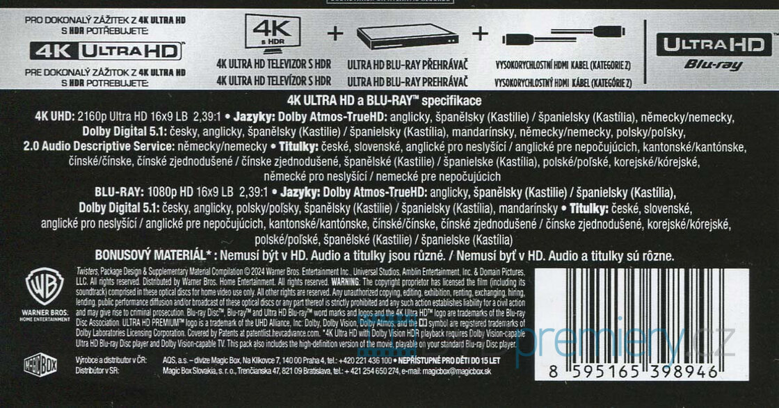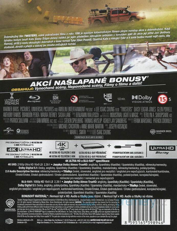 4K Blu-ray film Twisters HD [2024]. Český dabing. České titulky. Steelbook balení. HDR. Dolby Digital. Dolby Atmos. Volné pokračování filmu "Twister" z roku 1996.