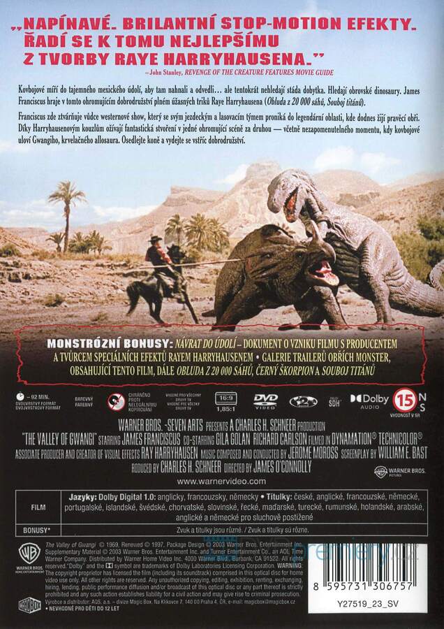 DVD film Údolí Gwangi [1969]. České titulky. Dolby Digital. Kovbojové loví dinosaury! Legendární dobrodružství s triky Raye Harryhausena. Gwangi, krvežíznivý allosaurus, čeká na odvážné jezdce.