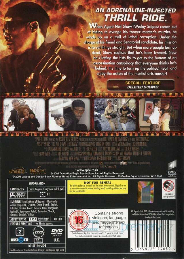 DVD film Umění války 2: Zrada [2008]. Český dabing. České titulky. Dovoz. Dolby Digital. Wesley Snipes jako Shaw se vrací z úkrytu, aby pomstil mentora – a čelí smrtící konspirace plné zrady a akce!