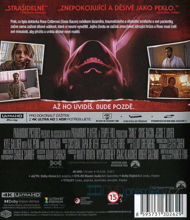 4K Blu-ray film Úsměv HD [2022]. Český dabing. České titulky. HDR. Dolby Digital. Dolby Atmos. Úsměv mění radost v noční můru. Horor, kde nejkrásnější emoce skrývá smrtelné nebezpečí přímo před vašima očima.