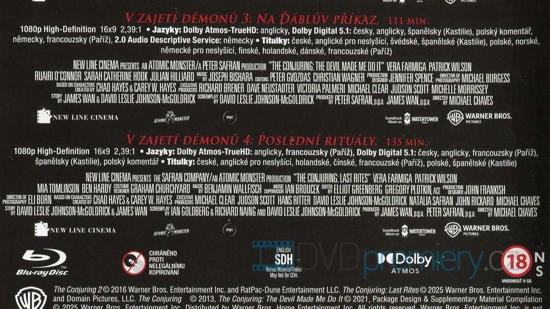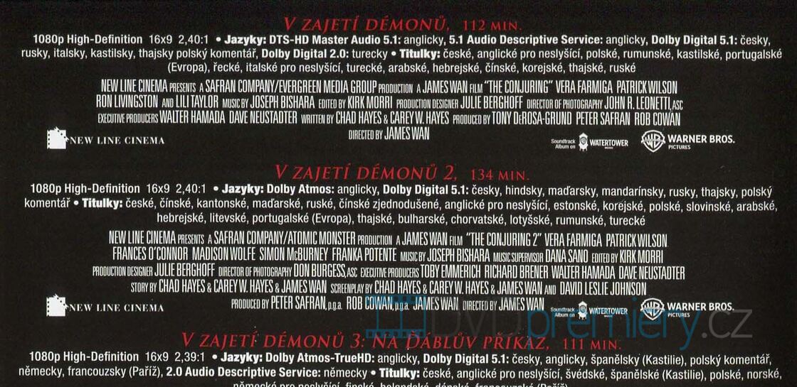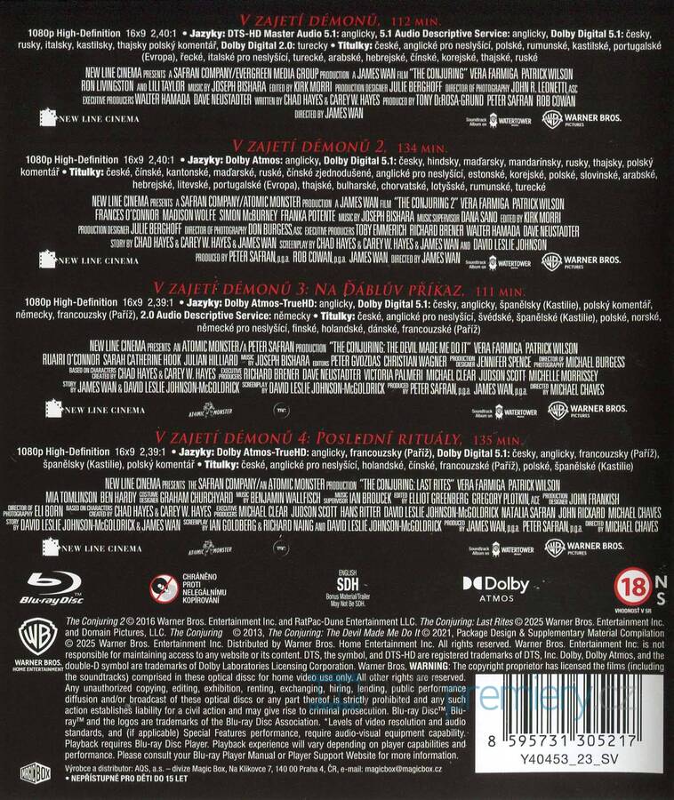 Blu-ray kolekce obsahuje filmy: V zajetí démonů (HD);V zajetí démonů 2 (HD);V zajetí démonů 3: Na Ďáblův příkaz (HD), V zajetí démonů 4: Poslední rituály (HD). Český dabing. České titulky. Dolby Digital. Dolby Atmos.