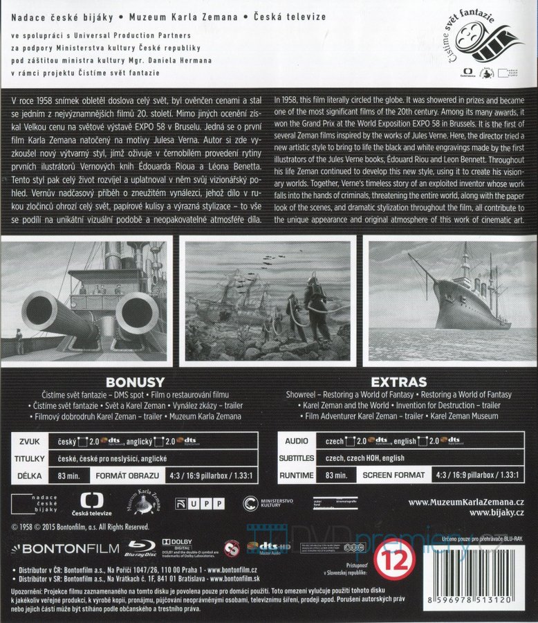 Bonusy: Čistíme svět fantazie – DMS spot • Film o restaurování filmu • Čistíme svět fantazie • Svět a Karel Zeman • Vynález zkázy – trailer • Filmový dobrodruh Karel Zeman – trailer • Muzeum Karla Zemana