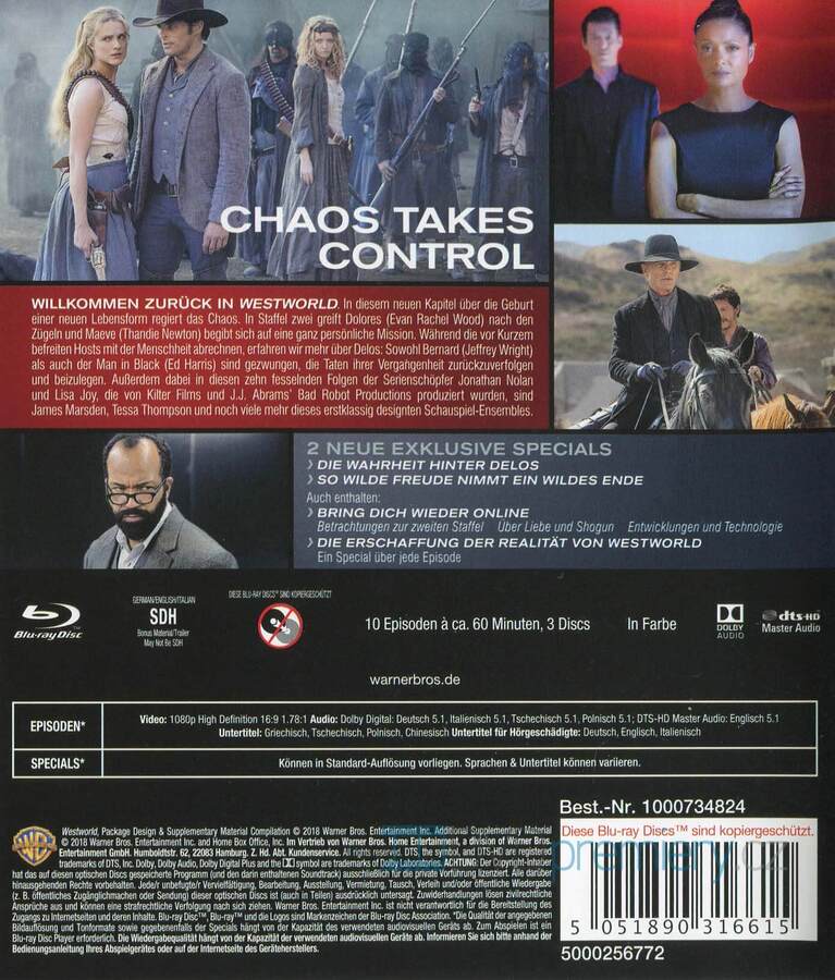 Blu-ray film Westworld 2. série HD [2018]. Český dabing. České titulky. Dolby Digital. Hostitelé se osvobodili. Dolores vládne, Maeve hledá. Chaos mezi lidmi a stroji začíná. 10 epizod plných zvratů.