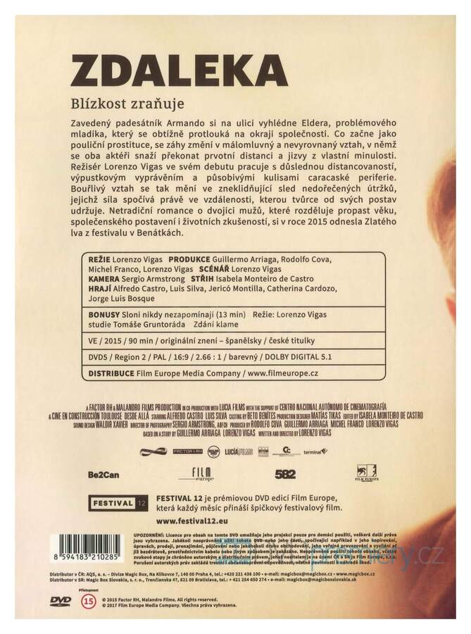 DVD film Zdaleka [From Afar, 2015]. České titulky. Netradiční romance o dvojici mužů, které rozděluje propast věku, společenského postavení i životních zkušeností, si v roce 2015 odnesla Zlatého lva z festivalu v Benátkách.