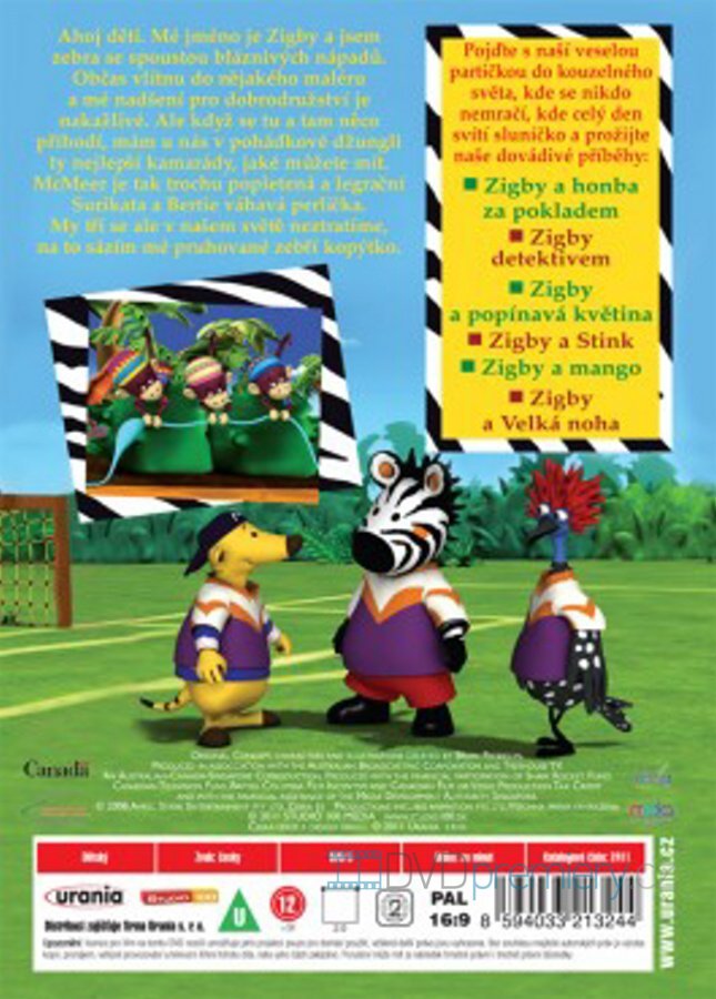 Občas vlítnu do nějakého maléru a mé nadšení pro dobrodružství je nakažlivé. A když se tu a tam něco přihodí, mám u nás v pohádkové džungli ty nejlepší kamarády, jaké můžete mít. McMeer je tak trochu popletená a legrační surikata a Bertie váhavá perlička. My tři se v našem světě neztratíme, na to sázím mé pruhované zebří kopýtko. Pojďte s naší veselou partičkou do kouzelného světa, kde se nikdo nemračí, kde celý den svítí sluníčko a prožijte naše dovádivé příběhy Zigby a honba za pokladem, Zigby detektivem, Zigby a popínavá květina, Zigby a Stink, Zigby a mango, Zigby a Velká noha.