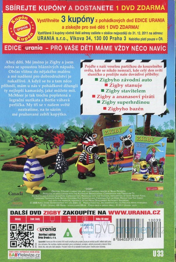 Občas vlítnu do nějakého maléru a mé nadšení pro dobrodružství je nakažlivé. A když se tu a tam něco přihodí, mám u nás v pohádkové džungli ty nejlepší kamarády, jaké můžete mít. McMeer je tak trochu popletená a legrační surikata a Bertie váhavá perlička. My tři se v našem světě neztratíme, na to sázím mé pruhované zebří kopýtko. Pojďte s naší veselou partičkou do kouzelného světa, kde se nikdo nemračí, kde celý den svítí sluníčko a prožijte naše dovádivé příběhy Zigbyho závodní auto, Zigby stanuje, Zigby stavitelem, Zigby a ananasoví piráti, Zigby superhrdinou, Zigbyho bazén.